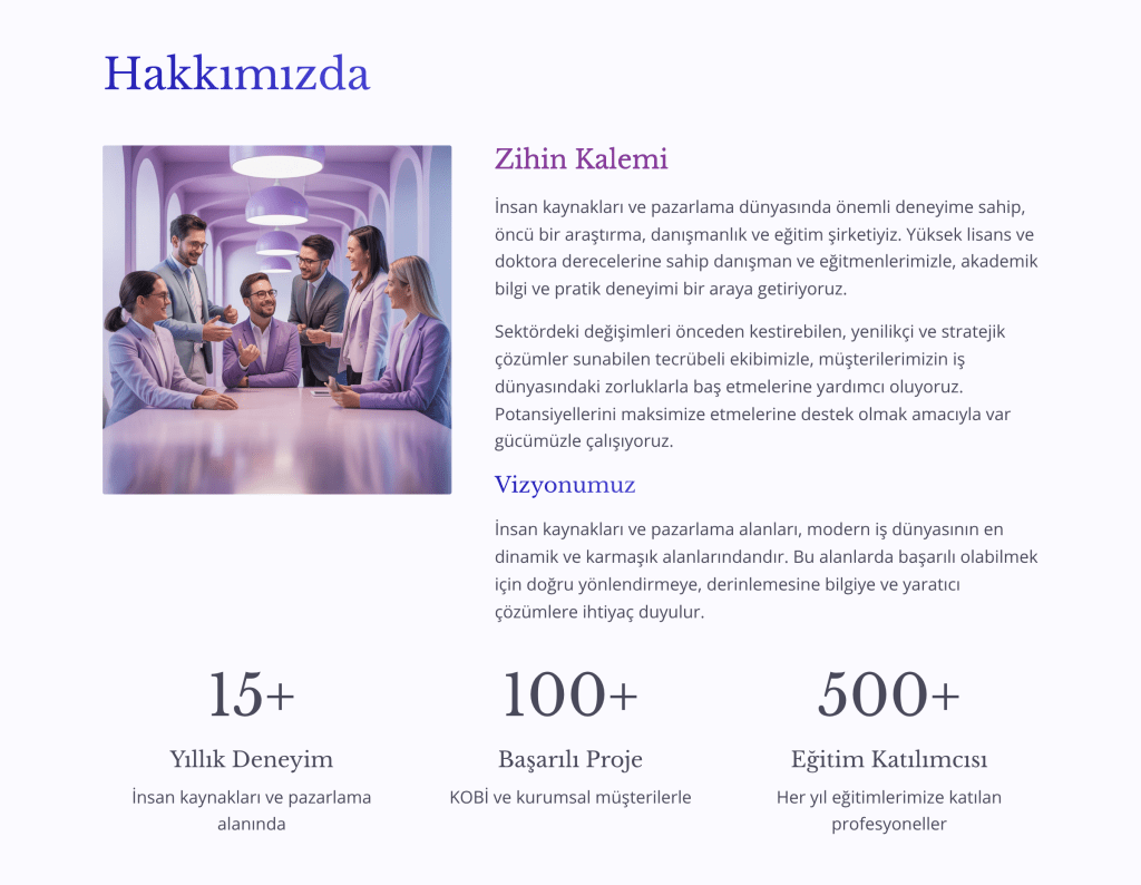 İnsan kaynakları ve pazarlama alanları, modern iş dünyasının en dinamik ve karmaşık alanlarındandır. Bu alanlarda başarılı olabilmek için doğru yönlendirmeye, derinlemesine bilgiye ve yaratıcı çözümlere ihtiyaç duyulur. Zihin Kalemi olarak, müşterilerimizin iş dünyasındaki zorluklarla baş etmelerine yardımcı olmak, potansiyellerini maksimize etmelerine destek olmak amacıyla var gücümüzle çalışıyoruz.